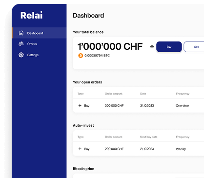 Relai Private is built for high-net-worth investors looking to buy or sell large amounts of Bitcoin (100’000+ EUR/CHF). You’ll get a tailored experience and expert guidance.